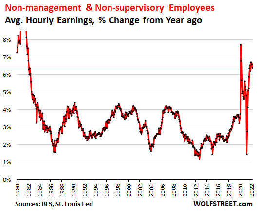 Average hourly earnings of non-management workers, the “production and nonsupervisory employees,” is a data set that goes back many decades and comprises workers in all industries of the private sector, and in all jobs that are non-management jobs, ranging from waiters to Google coders.