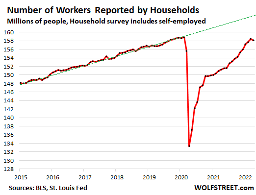 Households reported that the number of working people — including the self-employed, gig workers, and entrepreneurs that are not included in the Employer data above — declined by 353,000 in April, but over the past three months jumped by 931,000, bringing the total to 157.7 million workers.