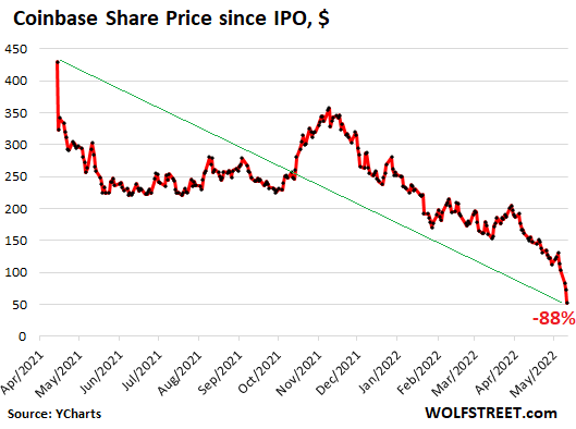 Turns out, cryptos aren’t fun anymore. They’re money-sucks – I mean fiat-sucks. Prices are plunging. Bitcoin is now at $27,144, down 60% from the peak in November. How the heck are you supposed to have fun trading, when you get powwoozzled on a daily basis? But Coinbase needs people to trade so that it can extract its fees.