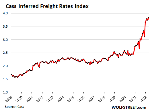 The Cass Freight Index for Inferred Freight Rates, which includes fuel surcharges and shows the overall movement in the costs of shipping, started spiking a year ago, and in April was up by 31% year-over-year. Compared to April 2019, it was up 58%.