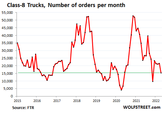Orders for Class 8 trucks in April, at 15,400 orders, were down 56% year-over-year, according to data from FTR. The drop in orders reflects “a market that is trying to minimize its exposure to the headwinds it could potentially face in 2023,” FTR said.