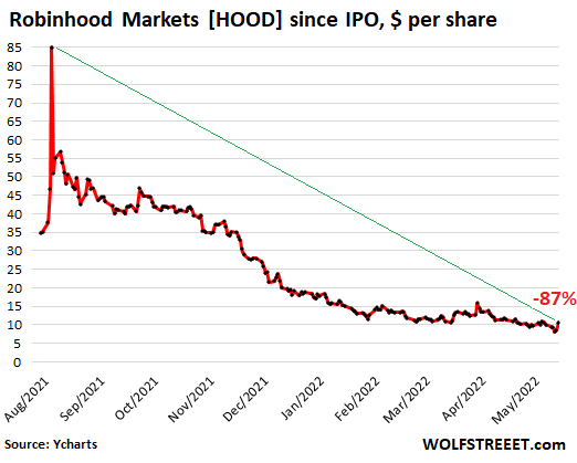 The headlines were everywhere last night and today: “Robinhood Soars…” or Robinhood Stock Soars…” because it soared, currently by 25% or so from the close last night, on the news that a “crypto billionaire,” namely Sam Bankman-Fried, the founder and CEO of crypto exchange FTX, bought 56.3 million shares of Robinhood [HOOD] for a 7.6% stake for about $648.3 million, according to Robinhood’s 13D filing with the SEC late yesterday.