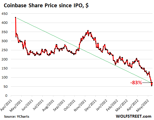 So the Oppenheimer analyst that had been hyping Coinbase all the way down with an “outperform” rating and a $197 price target then came out yesterday, saying that the new language in the 10-Q filing and the CEO’s tweets are “grossly misunderstood and being taken out of context.” And WHOOSH goes the stock in percentage terms, from the closing price on Wednesday of $53.72, up by 36%, to $71.65 currently, but on the chart since its IPO in April last year, it was just another small step on the uneven stairway to heck (data via YCharts):