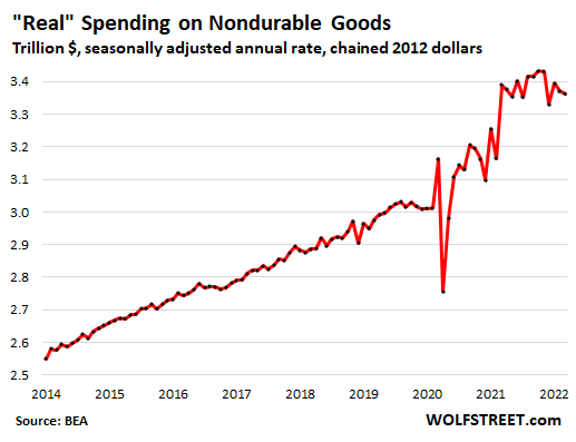 Spending on nondurable goods, mostly food, fuel, and household supplies, adjusted for inflation: