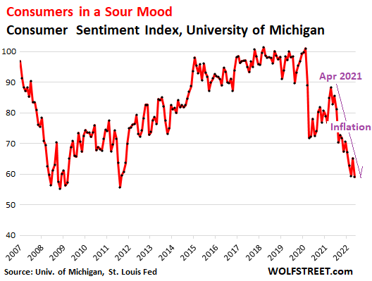 This surge in sales is happening even as consumer sentiment in May has dropped to a decade low, according to the University of Michigan Consumer Sentiment Survey. Overall sentiment was beaten down by worries about raging inflation that has spread across all sectors of the economy and is hitting consumers in face every day (data via St. Louis Fed and University of Michigan Survey of Consumers):