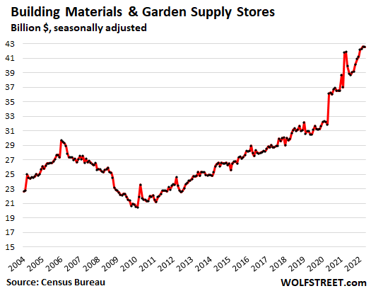 Building materials, garden supply and equipment stores: Sales were about flat for the month, at $43 billion, for a year-over-year gain of 1.7% from Stimulus Miracle April: