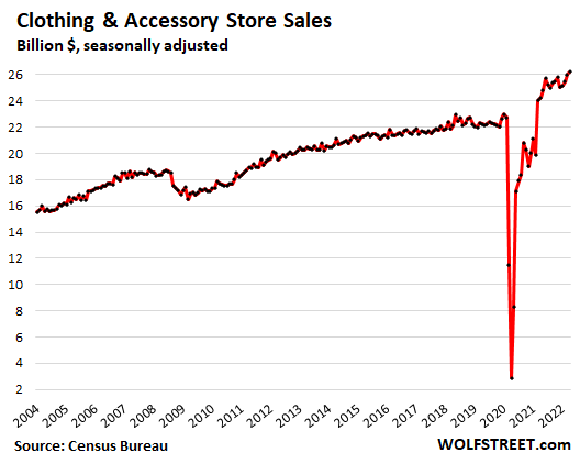 Clothing and accessory stores: Sales rose by 0.8% for the month, and by 8.0% year-over-year to $26 billion, seasonally adjusted: