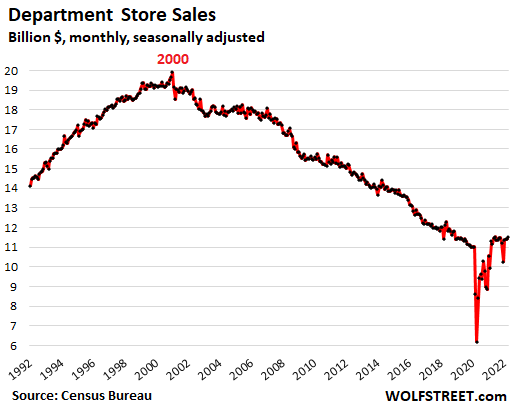 Department stores: sales rose 1.1% for the month, to $11.5 billion, and were up 2.9% from a year ago. Price increases made up for volume declines. Compared to the peak in the year 2000, sales were down 42%, as this format of store has fallen out of favor with Americans, triggering the closure of thousands of stores and numerous bankruptcies: