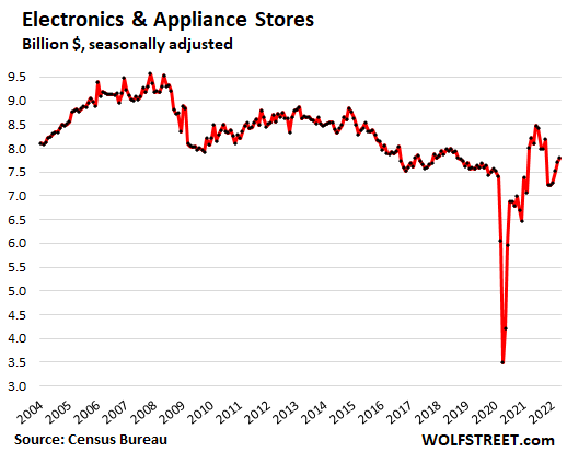 Electronics and appliance stores: Sales rose 1.0% for the month, to $7.8 billion, seasonally adjusted, but were down 5.2% year-over-year. This segment covers only sales in specialty electronics and appliance stores, such as Best Buy or Apple stores. Electronics and appliances are a large business that is spread across many types of retailers, such as General Merchandise and ecommerce retailers, and electronics and appliance sales at those retailers are included in their segments (above).