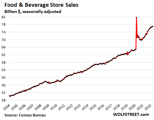 Food and Beverage Stores: Sales dipped 0.2% for the month to $77 billion, seasonally adjusted, but were still up by 7.1% year-over-year, powered entirely by price increases: