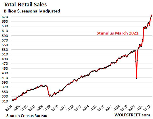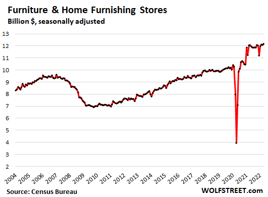 Food services and drinking places: Sales at these bars, restaurants, cafes, cafeterias, etc. jumped by 2.0% for the month seasonally adjusted, to a record $84 billion, and by 19.8% year-over-year. This growth rate is nearly three times the rate of CPI inflation for “food away from home” (7.2%), which indicates that people are going out to splurge and enjoy and perhaps douse their sour mood with the appropriate liquidity, and they’re spending heroic amounts of money to do it.
