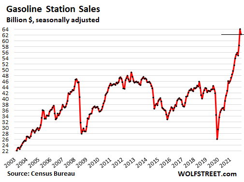 Gas stations: Sales fell by 2.7% for the month, on falling gasoline prices, to $62 billion, seasonally adjusted. Year-over-year, sales were still up by 36.9%, powered entirely by the year-over-year spike in gasoline prices.