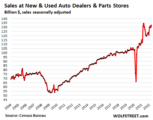 Sales at New and Used Vehicle and Parts Dealers, the largest retailer category, rose by 2.2% in April from March, to $132 billion, seasonally adjusted, but were down 1.7% from a year ago. Used vehicle prices have started to tick down on a month-to-month basis, though they remain much higher than a year ago, while new vehicle prices continued to spike at record pace as new vehicle dealers are woefully low on inventory. And retail sales in dollar terms are the result of this mix: