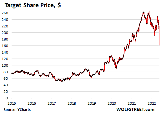 Turns out, inflation is eating up retailers’ profit margins. “Throughout the quarter, we faced unexpectedly high costs, driven by a number of factors, resulting in profitability that came in well below our expectations, and well below where we expect to operate over time,” the earnings release said. Shares kathoomphed 25% during the day and afterhours to $161.61, and were down 38.8% from the peak last August: