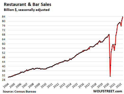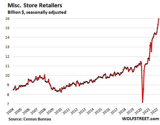 The hot retailer categories. Retail sales were hot in April and the prior months at “eating and drinking places” (+20% year-over-year) and at “miscellaneous stores,” which include cannabis stores where business is booming (+19% year-over-year).