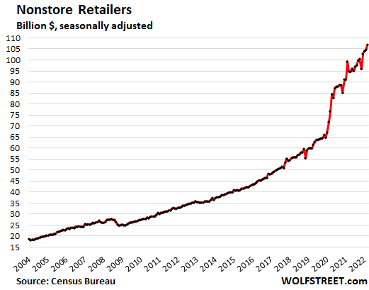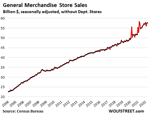 Target and Walmart are part of the retailer category “general merchandise stores,” where retail sales in April – that would the final month in most retailers’ Q1 – were very high, but were up by less than 1% from the historic stimulus-miracle April a year ago (from my report about retailers by category). Note the three giant spikes during the months when the three stimulus checks went out:
