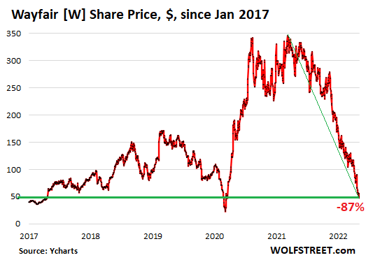 Wayfair [W], the online furniture retailer, had reported a huge loss on May 5, and its revenues actually fell 14% from the stimulus-miracle-Q1, and its shares have gotten shookalacked, including today (-14% during regular trading and afterhours), and are down 87% from their peak in March 2021 and are where they’d been in 2017. Because raging inflation, at some point, is no one’s friend.