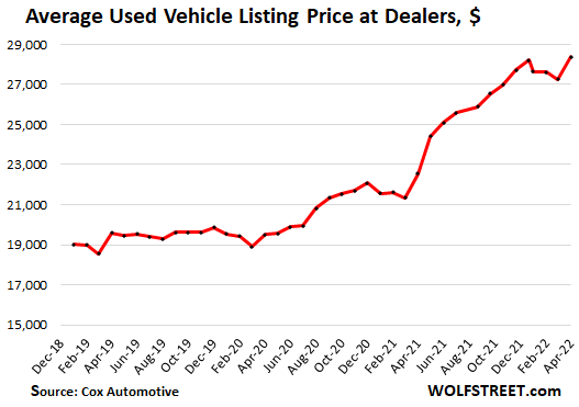 Average listing prices of used vehicles on dealer lots rose by 4.1% in April from March, after three months of declines, in line with seasonality, and was up 26% year-over-year, according to Cox Automotive, based on its Dealertrack data last Thursday. The year-over-year spike had peaked at 28% late last year and early this year.