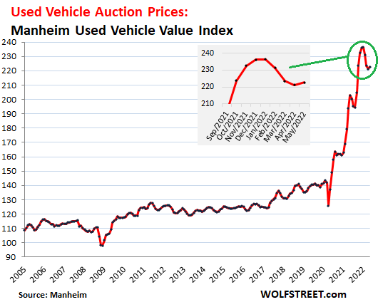 Used-vehicle wholesale prices suddenly rose again by mid-May, after falling three months in a row, seasonally adjusted, with the underlying dynamics firming up in May as well, according to the mid-month update by Manheim, the largest used-vehicle auction house in the US. And prices might rise further in the second half of May, according to underlying auction dynamics.