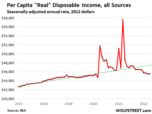 Here is the per-capita level of “real” disposable income – meaning per-person after-tax income from all sources, which was flat for the month and down 6.4% from a year ago, and up just a tiny minuscule 1.8% from April 2019. And it’s deeply below pre-pandemic trends: