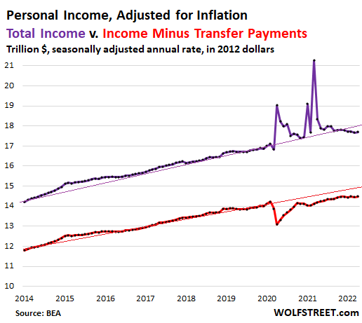 Inflation-adjusted income without transfer payments rose by 2.0% from a year ago, and by 0.3% in April from March (red line). It fell below pre-pandemic trend at the beginning of the pandemic. After a partial recovery, it lost more ground since late last year due to the surge in inflation and has remained essentially flat since November.