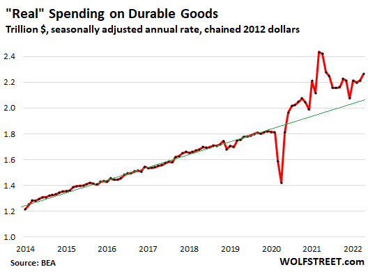 Compared to the stimulus-miracle spike in April last year, real spending on durables was down 6.5%. Spending remains at nosebleed levels, up 29% from April 2019, and continues to contribute to the shortages and price spikes of some of these goods, and to the massive trade deficit as many of these goods are either made in other countries or contain components that are made in other countries.