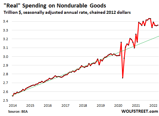 Even after the year-over-year decline, consumer spending on nondurable goods remains at nosebleed levels, up by 12% from April 2019, and well above the pre-pandemic trend (green line). But it is on track to gradually normalize and revert to pre-pandemic trend: