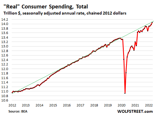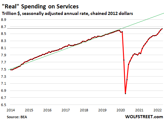Spending on services include housing (such as rents), healthcare, education, travel (plane ticked, hotels, Ubers), insurance, financial services, entertainment and sports events, etc. They’re 70% of what consumers spend their money on. And yes, it will get back to trend just fine.