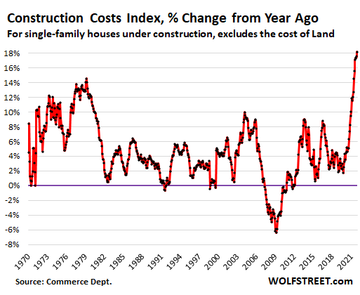 Construction costs of single-family houses – excluding the cost of land and other non-construction costs – spiked by 18.2% year-over-year, the worst spike ever in the data going back to 1964, and the fifth month in a row with year-over-year spikes of over 17%. Over the past two years, the construction cost index spiked by nearly 30%. Over the 4-year period you’re looking at, it spiked by 38%