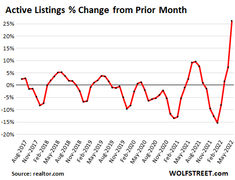 Active listings jumped. In May, inventory of homes actively listed for sale jumped by 26% from April and are suddenly up by 8% from a year ago, the first year-over-year increase since June 2019, according to the National Association of Realtors today. There were about 38,000 more homes listed for sale in May than a year ago (data via realtor.com):