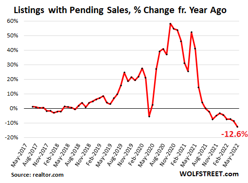 One, falling sales, as potential buyers left the market due to sky-high home prices and holy-moly mortgage rates. The NAR’s metric of “pending listings” for May, which tracks listings that are in various stages of the sales process, but before the deal closes, dropped by 12.6% year-over-year in May, after the 8.7% drop in April, the ninth month in a row of year-over-year declines: