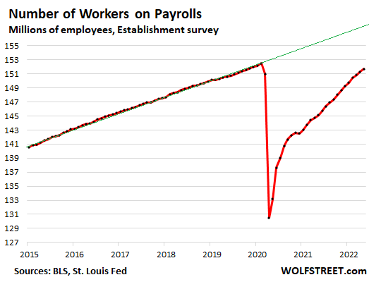 Payrolls remain 822,000 employees below the pre-pandemic peak and far below the pre-pandemic trend (green line).