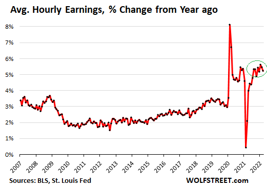 Average hourly earnings of non-management workers, the “production and nonsupervisory employees” in all industries combined, from waiters to coders, as long as they were in non-management roles, rose by 0.6% (15 cents) for the month, and by 6.5% from a year ago to $27.33 per hour.