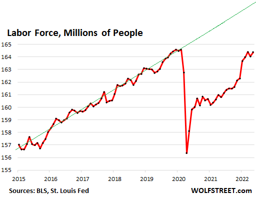 The labor force – the people who are working plus the people who are actively looking for work – jumped by 330,000, nearly reversing the entire decline in April, and at 164.38 million is just a tad below where it had been in March. It remains 207,000 people below February 2020 and far below the pre-pandemic trend. There are plenty of people in the US, it’s just that not enough of them, for whatever reasons, are actively chasing after a job in the rat race. And this has some big consequences.