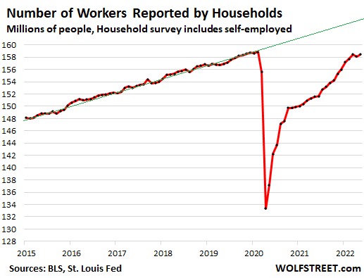 Households reported in a separate survey by the BLS today that the number of working people — including the self-employed and entrepreneurs that are not included in the employer data above — rose by 321,000 in May, largely undoing the dip in April, to 158.4 million.