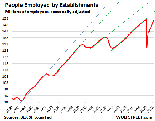 My guess is that the 1982 trendline of the 80’s recovery, would be at least 200 million today (vs. the actual 150 or so million) – that means 50 *million* jobs short of what we would have if the 2000-2020 period grew jobs as the 80’s did.