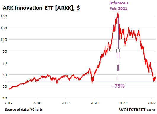 The fund, which tracks a collection of ridiculous highfliers, dropped 7.1% on Friday and 9.7% for the week, to $40.11, above its 52-week closing low of May 11. The fund is down 75% from its high on February 16, 2021 – yes, that February 2021 – and is back where it had first been in May 2017.