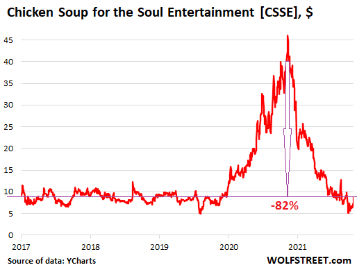 The other option for the meme stock jockeys is to also drive up Chicken Soup [CSSE]. On Friday, shares jumped by 19%, and for the week, they jumped by 35%, and over the past month, they jumped by 68%. But at $8.76 on Friday, they’re still down 82% from the high in June 2021, and at this price each bag holder would still only get $0.76 a share of Redbox that they paid $13.67 for today (data via YCharts):