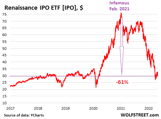The Renaissance IPO ETF [IPO] dropped 4.5% on Friday and 7.9% for the week, is down 61% from its high on February 16, 2021, and is back where it had first been in May 2018 (data via YCharts):