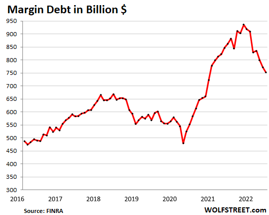 Margin debt – the visible tip of the iceberg of the direction of overall stock-market leverage – dropped by $20 billion in May from April, to $753 billion, according to Finra, based on reports from its member brokers. Margin debt had peaked in October 2021 at $936 billion, and began to decline in November 2021.