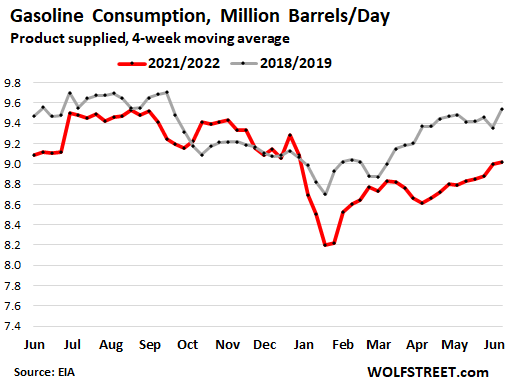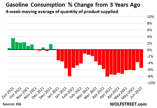 Gasoline demand destruction has already set in. In October, November, and December last year, gasoline consumption ran above the levels of the same period three years earlier, in 2018. In the first half this year, for every week, consumption has been lower than in the first half of 2019, the last year before the pandemic shifted everything around.