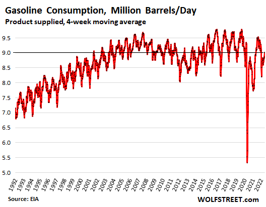 Long-term, gasoline demand in the US is already on the way down. But it’s going to be a slow process. The current consumption level of 9.02 million barrels per day was first hit in July 2000. Gasoline consumption on an annual basis peaked in 2007, and declined for years, then rose again and matched that level again in 2016, 2017, 2018, and 2019.