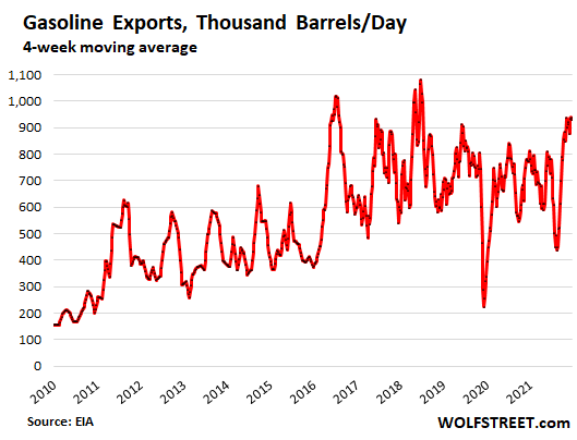 It’s complicated by large-scale exports of gasoline by the US to other countries, currently running at over 900,000 barrels per day, which amounts to roughly 10% of US domestic consumption.