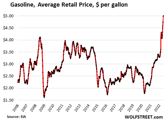 With the average price of gasoline edging over the $5-mark on Monday, up 63% from a year ago, according to EIA data, and having gone over the $4.20-mark for the first time ever in mid-March, people are already driving less, and households are prioritizing their most fuel-efficient vehicle. Buying patterns are already changing in favor of smaller fuel-efficient vehicles, hybrids, and EVs, except they’re sold out, while pickups and large SUV have started to accumulate on dealer lots.