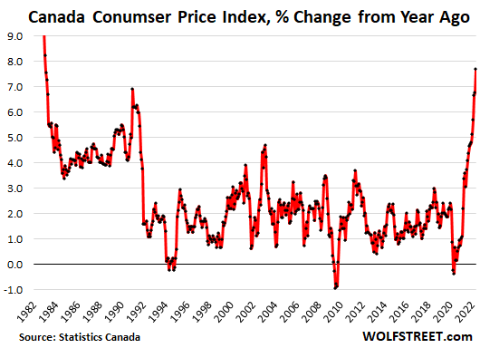 The headline CPI for Canada spiked by 7.7% in May compared to a year ago, the worst inflation rate since 1983, according to Statistics Canada: