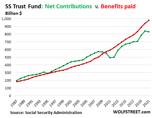 But the burden of interest expense is near historic lows. The government’s tax revenues rise with GDP and with inflation, because growth in economic activity and profits and wage inflation create higher tax revenues, and the Fed’s creature of asset price inflation created higher capital gains tax revenues, though they will go into a tailspin as assets are being repriced under QT and higher rates, and capital gains turn into capital losses.