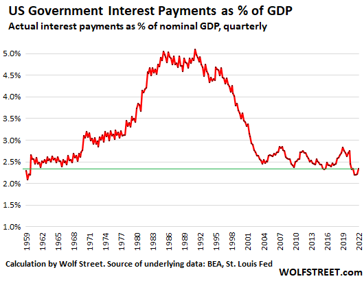 There has been a lot of hand-wringing recently among the tightening deniers. They’re now saying, in their latest barrage, that the Fed can never raise its policy rates above x%, such as 2% or whatever, because the government can never pay those higher interest rates on its huge debt and will go bankrupt. And look, they say, interest payments already jumped, and no way that the government can pay much more than that.