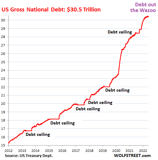 Interest expense increased sharply because of the spike in debt. Since March 2020, the gross national debt spiked by $7 trillion, or by 30%, from $23.5 trillion in March to 2020, to $30.5 trillion currently.