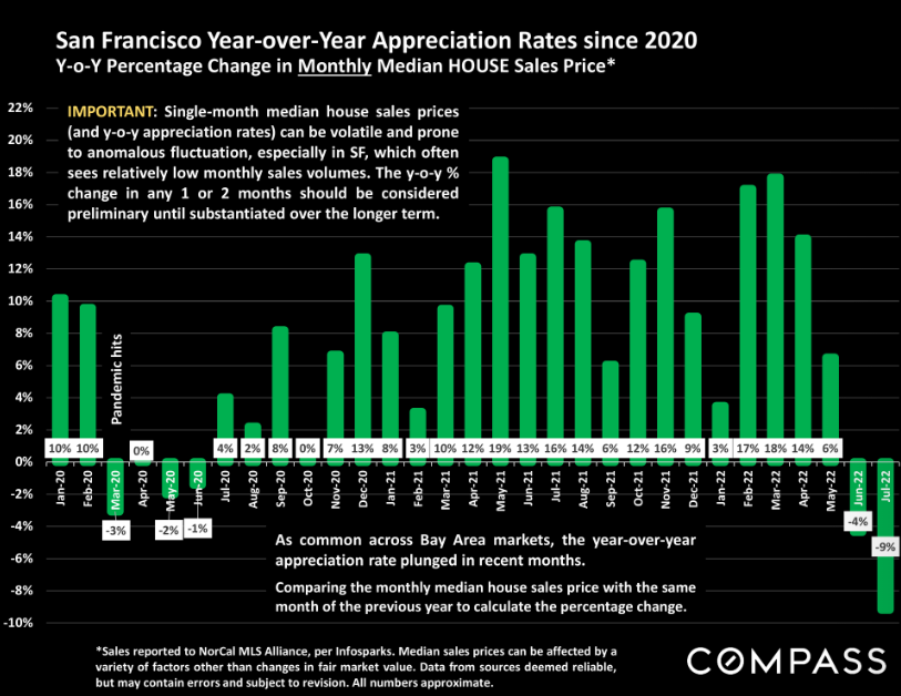 Price has started to follow volume. Year-over-year, the median price of houses across the Bay Area was down for the first time since lockdown May 2020.