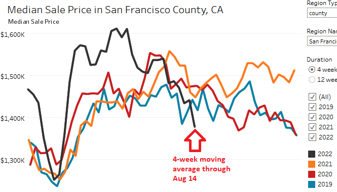 Year-over-year, it was down in three of the five big counties that cover San Francisco, Silicon Valley, and part of the East Bay, led by San Francisco, where the median price was down 8.2% year-over-year. We’ll get to the charts in a moment.